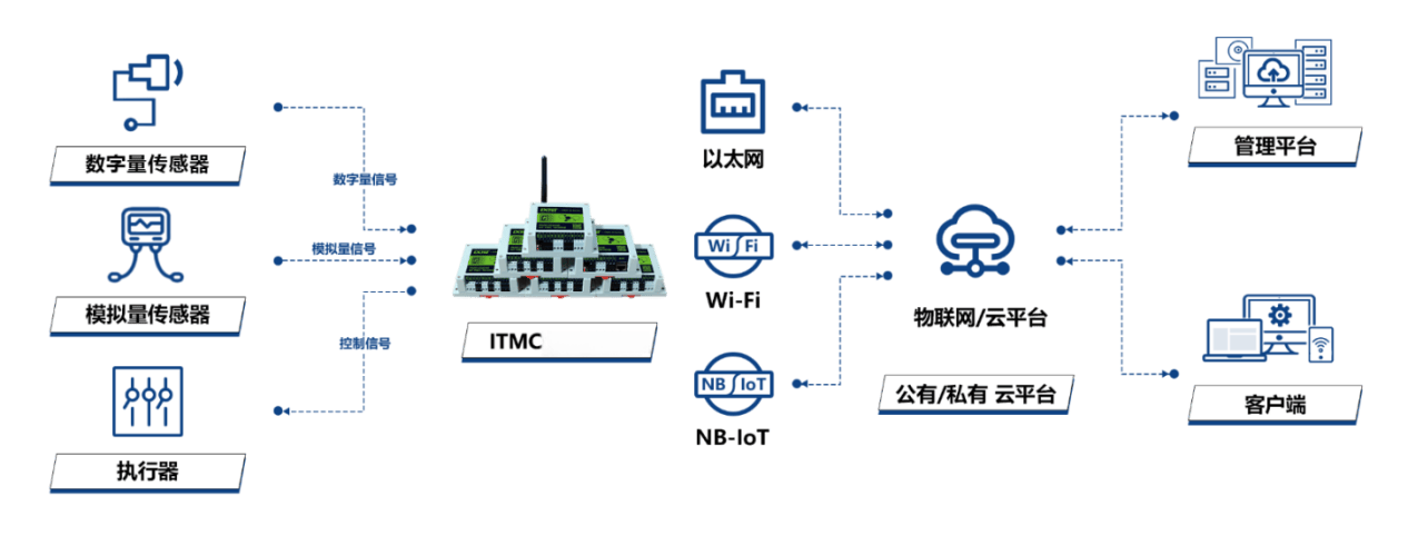 ITMC 物联网测控终端(+传感器):终端具有多路并行多传感器(数字量、模拟量传感器)实时信号采集,边缘数据处理功能实时将采集到的信号转换为物理量,同时自带本地联动控制输出,出现异常状况无需网络也可及时本地报警输出。作为工业自动化领域的核心关键设备,它可与 MES 系统无缝对接,能够高效传输设备的运行状态、各类工艺参数等重要数据。该终端具备丰富多样的通信接口,涵盖有线 RJ45 以及无线 WiFi、NB - IoT、4G 等多种通信方式,支持端、边、管一体化的零代码编程操作,极大地方便了企业快速构建完整的 MES 数据采集系统,有力提升了工业自动化生产管理水平和数据交互效率。